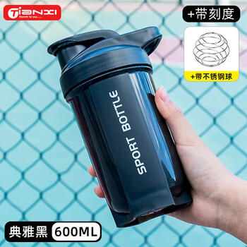 天喜(TIANXI)摇摇杯塑料杯运动健身带刻度水杯子蛋白增肌粉代餐杯 黑色600ml